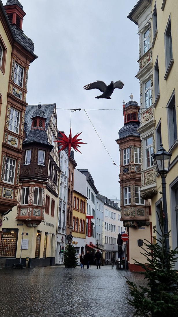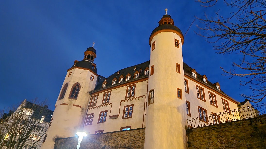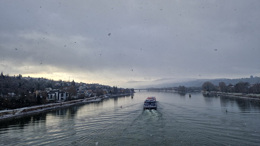 In der Nacht hat es geschneit und an Silvester schneit es auch noch bis mittags weiter. Am Vormittag steigen wir über die Teufelstreppe zum Hotel Rheinkrone. Dort hat man einen tollen Blick über Koblenz. Zurück in der Stadt ergattert Horst einen spontanen Termin beim Friseur. Die netten Damen dort legen uns für einen Ausflug das Moseltal ans Herz.