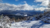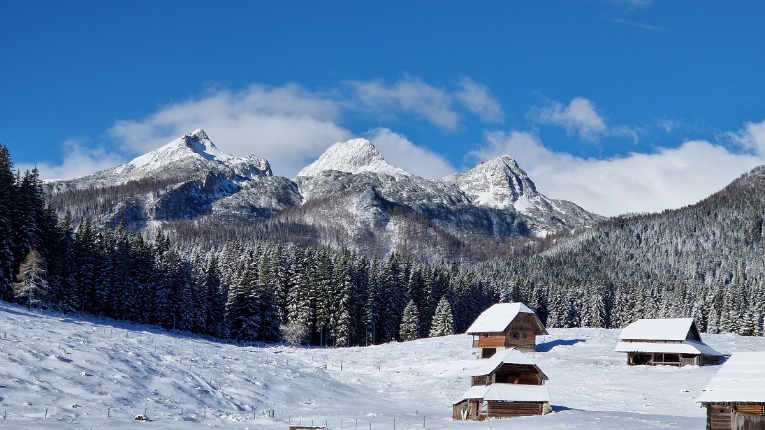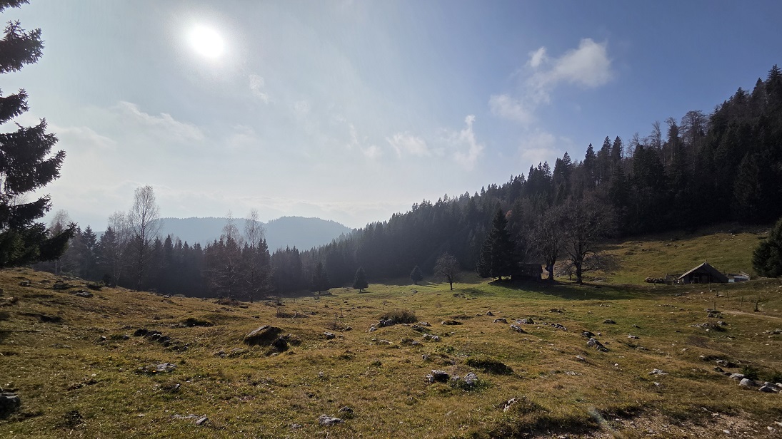 Am Dienstag haben wir gutes Wetter, aber es ist sehr kalt geworden. Wir haben eine Tour auf den Debela pec im Pokljuka geplant. Mit dem Auto geht es hoch bis kurz vor Pokljuka, hier liegt bereits Schnee. Zuerst geht es recht moderat zur Lipica Alm mit einem tollen Panorama, dann weiter zur Planina Lipanca Hütte.