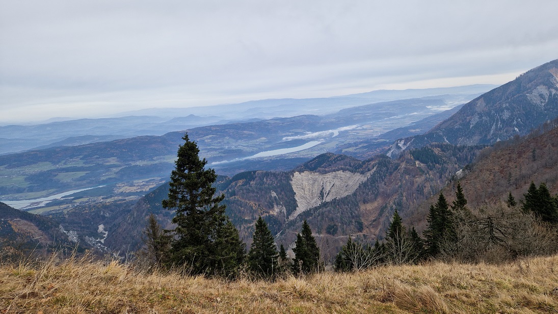 Wir gehen noch ein gutes Stück am Grat weiter, dann sehen wir aber, dass es zum Gipfel des Debela pec noch ein ziemliches Stück ist und es ist schon nach eins. Da es jetzt im November schon früh dunkel wird, beschließen wir daher lieber umzukehren und nur noch den kleineren Gipfel des Okroglez mit 1.965 m mitzunehmen.