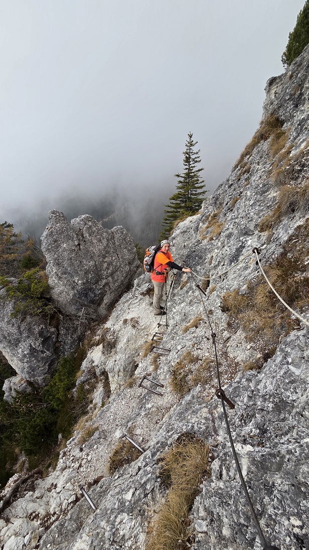 Keine Sicht, kalt, stürmisch - da halten wir uns nicht lange auf dem Gipfel auf und steigen schnell zur Golica Hütte ab. Dort machen wir Brotzeit und nehmen dann den direkten Steig zurück nach Planina pod Golico, mit einer spannenden Passage über Eisenstege mit Seilsicherung. Nix für schwache Nerven!