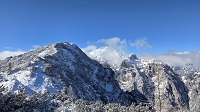 Nach der Hütte wird es dann schwierig. Es folgen zwei lange, sehr steile und felsige Anstiege und der Weg ist schwer zu finden, da die Markierungen zugeschneit sind und wir als erste nach dem Schneefall unterwegs sind. Laut Internet soll die Tour auch bei Schnee problemlos machbar sein, das würde ich aber so nicht unterschreiben. Durch den Schnee ist es auch extrem anstrengend und ich bin ziemlich k.o. Auf dem Grat werden wir dann aber zumindest mit einem tollen Blick auf den Triglav belohnt.
