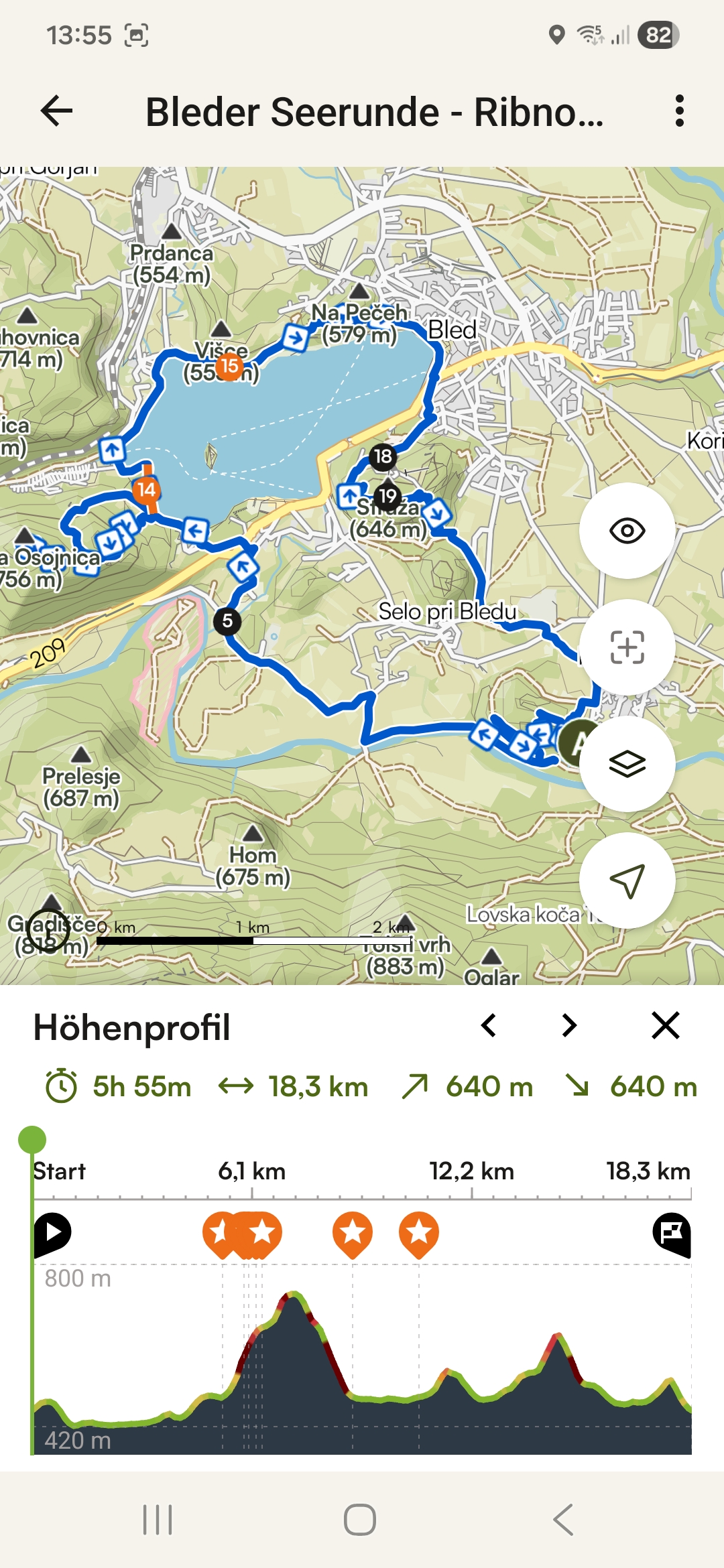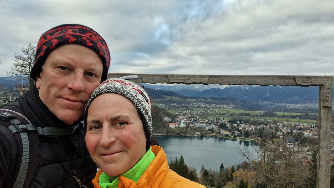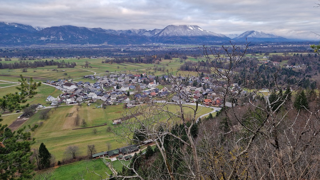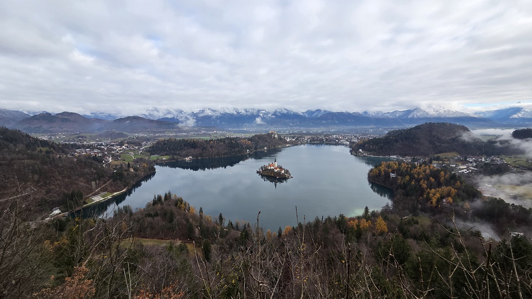Vom See aus nehmen wir den durchaus anspruchsvollen Steig links zuerst auf den Mala Osojnica und dann weiter auf den Velika Osojnica. Von beiden Hügeln aus hat man eine fantastische Aussicht auf den Bleder See und in die Karawanken, die nur leider unter Wolken liegen. Auf dem einfacheren Abstieg geht es zurück zum See und am Ufer entlang zur Bleder Burg.