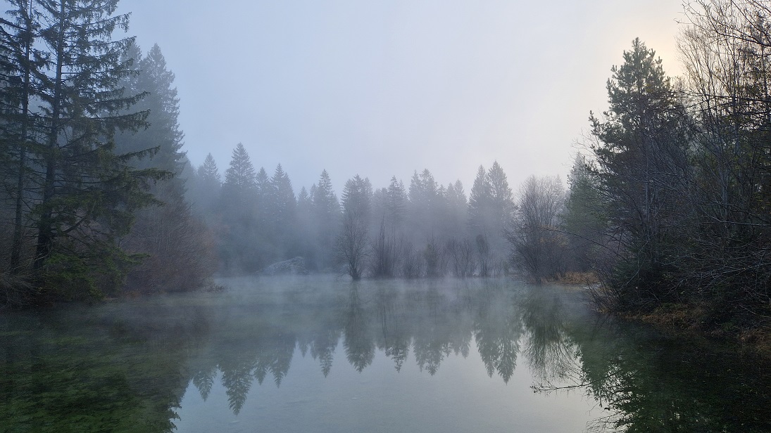 Für den letzten Tag haben wir uns eine Wanderung direkt vom Hotel rund um den Bleder See mit diversen Aussichtshügeln vorgenommen. Los geht's im Nebel vom Hotel aus hinunter ins Tal der Sava Bohinjka und am Fluss entlang zum Bleder See.